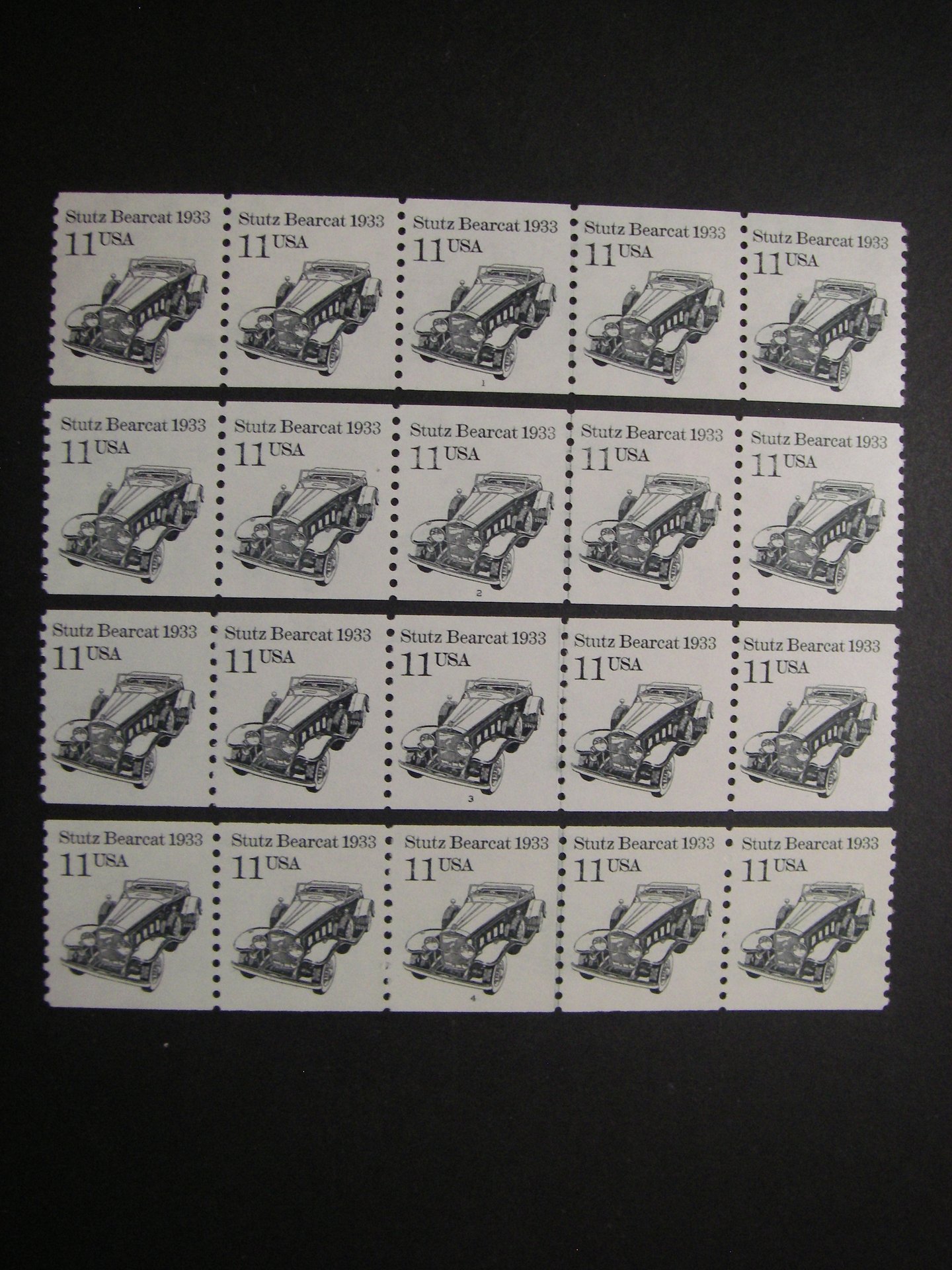 Here are post office fresh examples of the 11 cent Strutz Bearcat coil, Scott 2131, from the transportation coil series. You will receive four mint never hinged plate number strips of five with plate number 1, 2, 3, and 4. All the known plate number combinations released on this issue. Are they missing from your collection? Why not add them today? Good luck bidding and I'm happy to answer any questions you may have. PNC3 life member.Seller Information