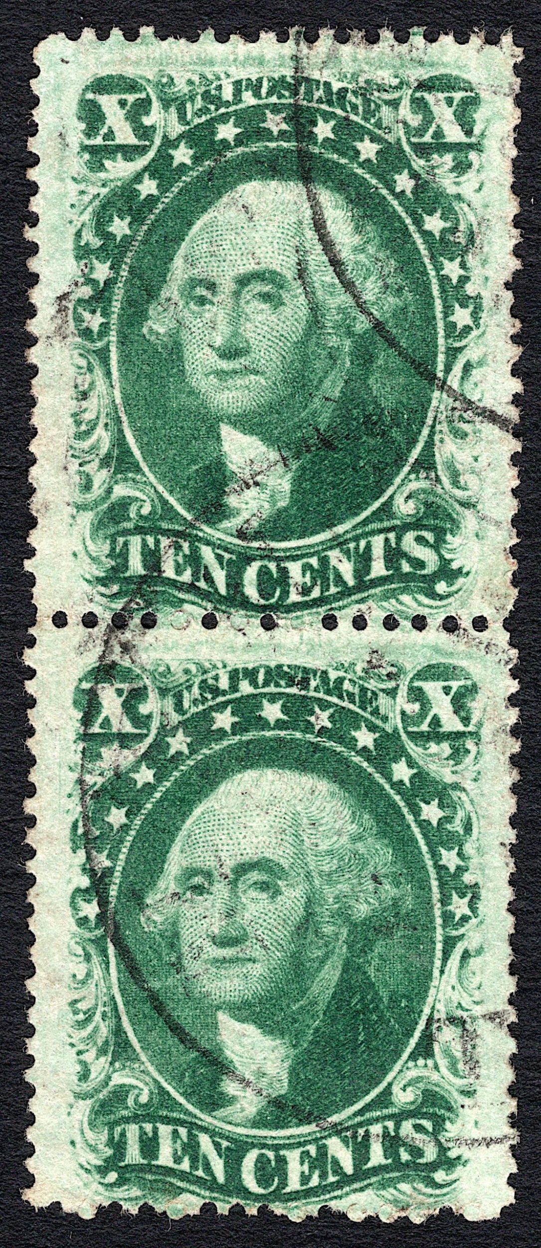 Scott 35, vertical pair, tiny corner tip crease at lower left corner of bottom stamp.