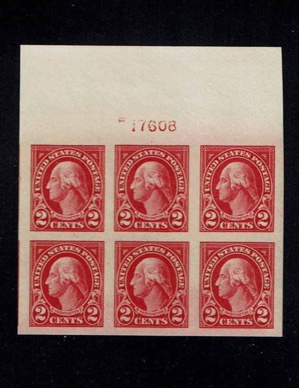 Stunning top margin plate number block of six stamps. Huge boardwalk margins on all sides. A GEM QUALITY full wide top position. Destined for the finest collections.Seller Information