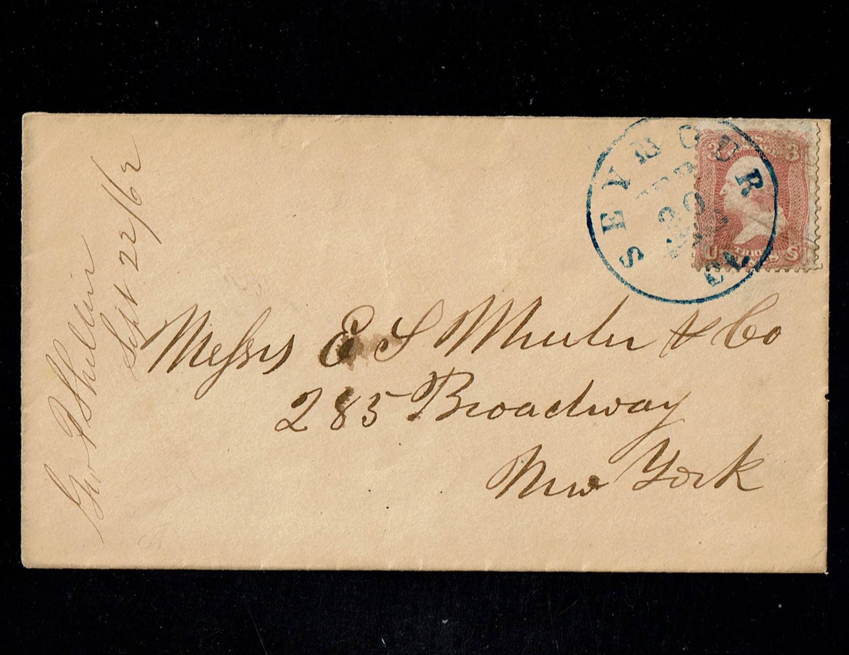 Tied on cover to New York City. Neatly struck blue "Seymour, Ct., Feb 20" town cancellation. Nice postmark!