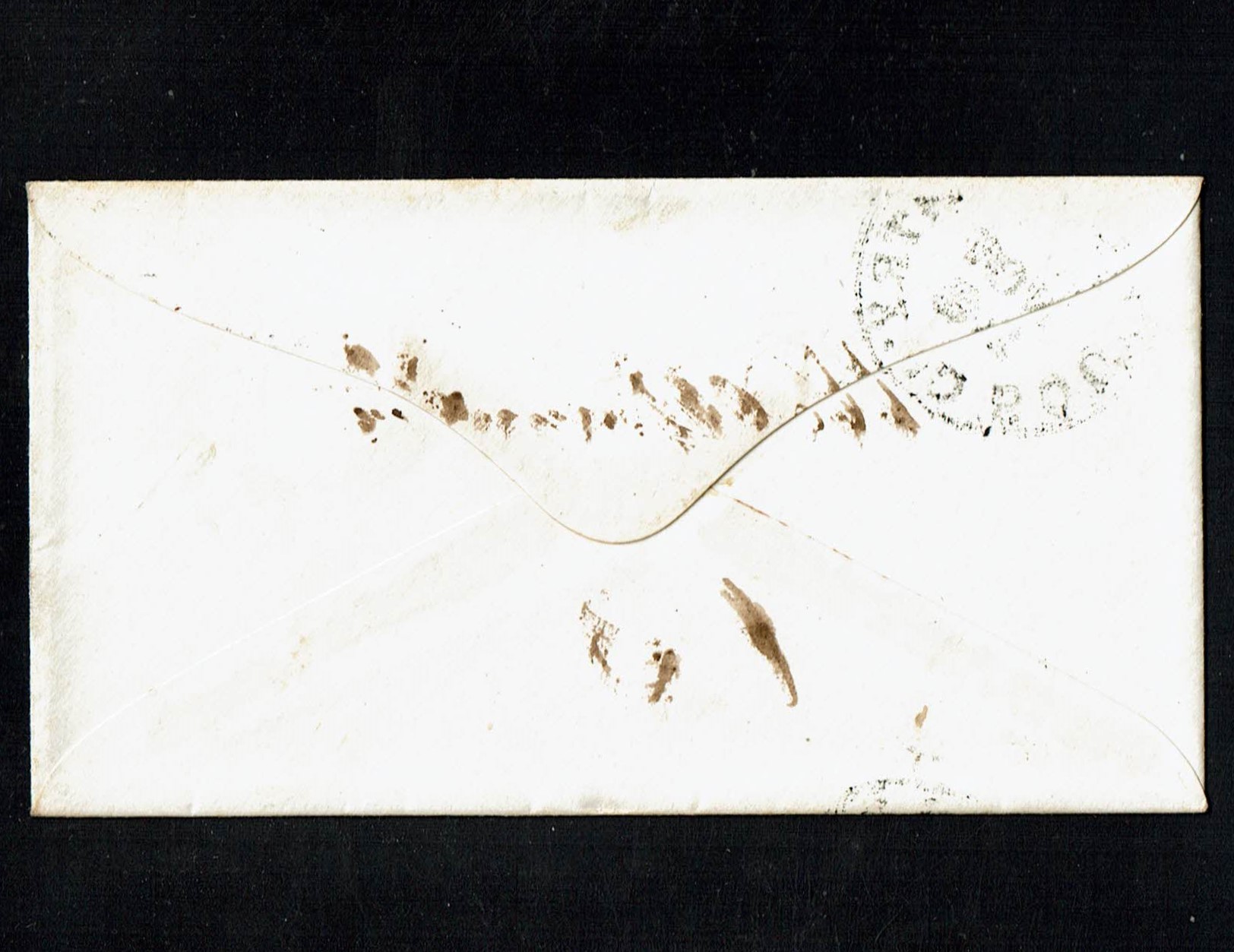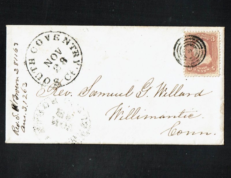 Tied on 1863 cover to Willimantic, Conn by black target cancellation with matching adjacent "South Coventry, Ct., Nov. 28" town cancellation.