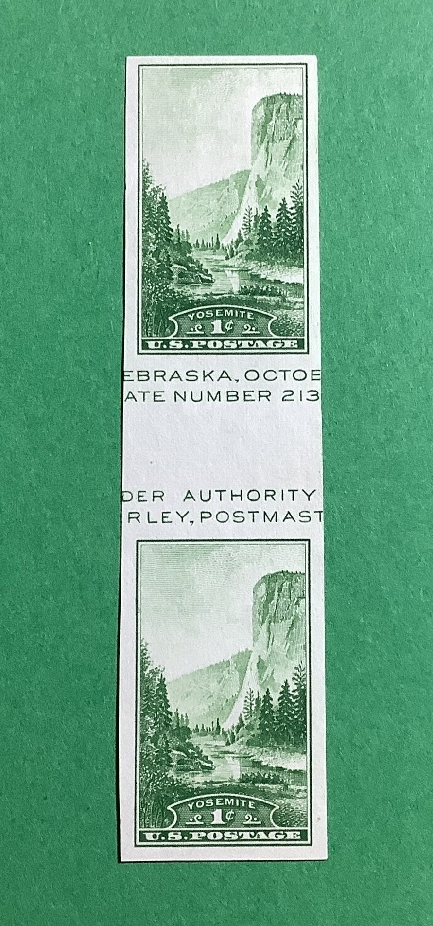 Scott 769a Pair of 1¢ Yosemite Stamps, no gum as issued, horizontal gutter, MNH. Photos shows the actual item you will receive. Smoke free home. Thank you for viewing.