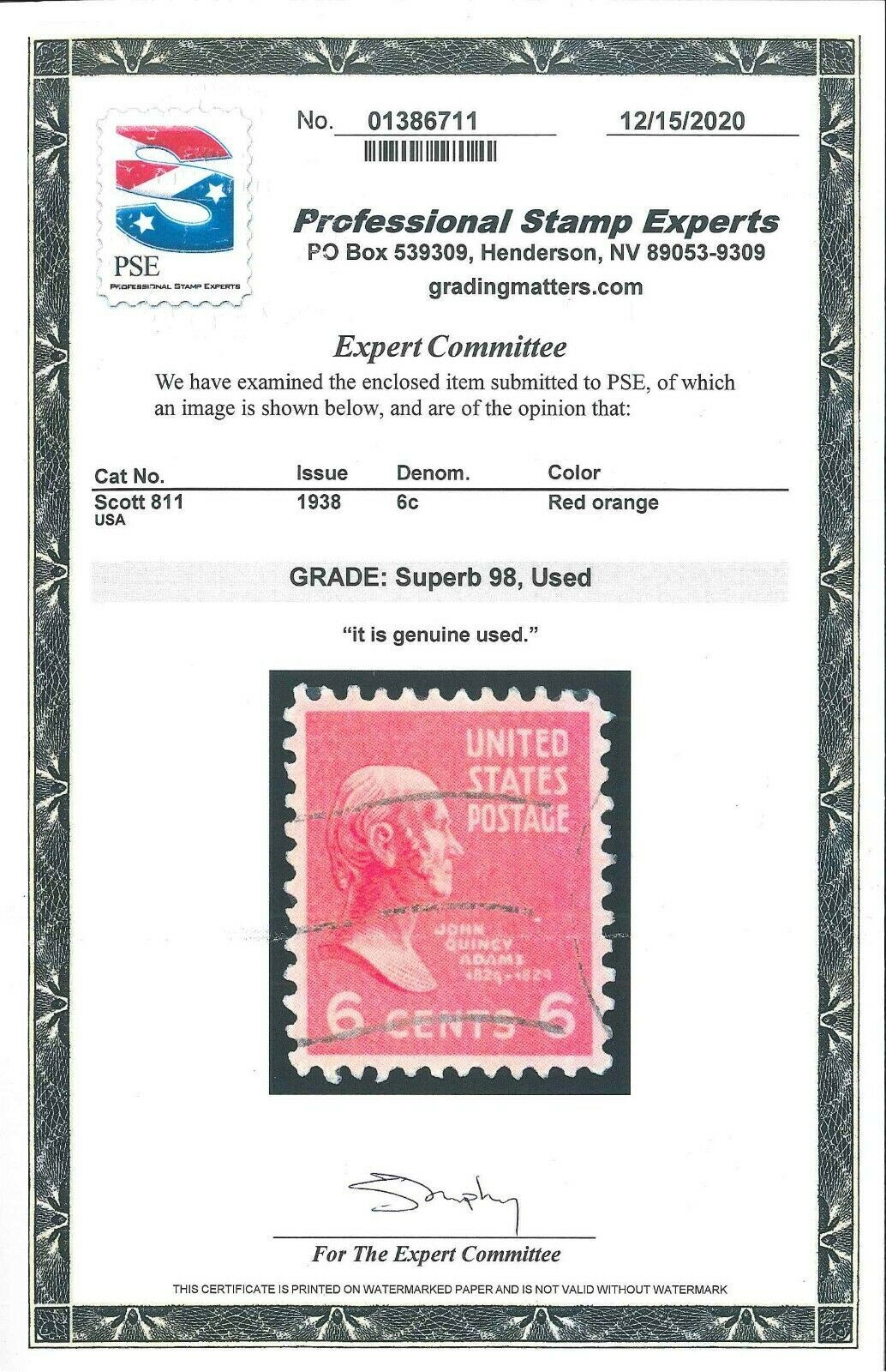 Scott 811 Used PSE Cert. Superb 98 (LB 9/21)