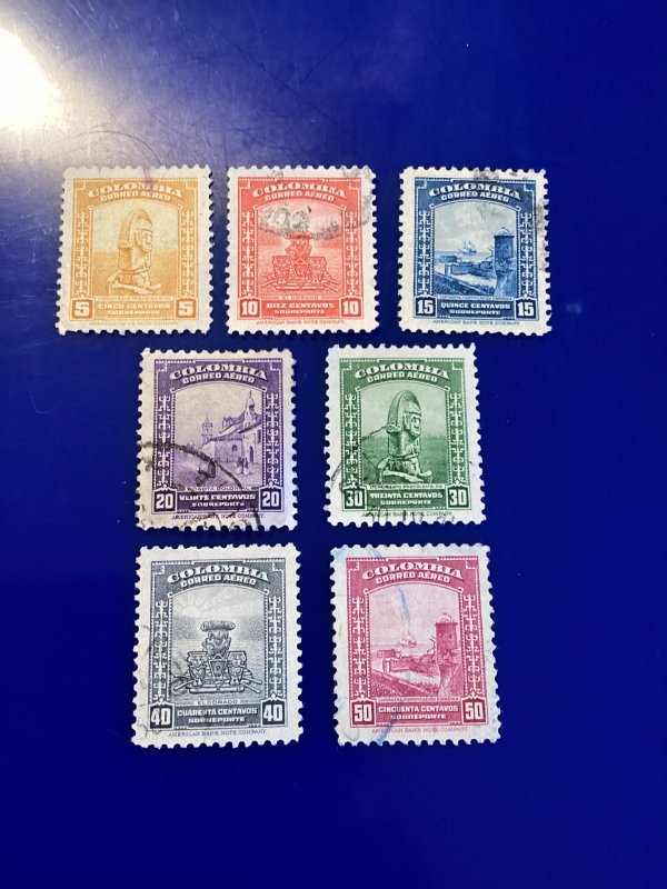 7 Columbia air mail stamps. Scott numbers C151-C157. Very nice centering, colors and graphics.