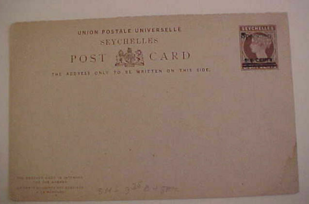 SEYCHELLES SPECIMEN POSTAL CARD 1890's . FINE CONDITION. SHIPPING AND HANDLING $1.50 USA, INTERNATIONAL $2.99 MULTIPLE WINNING BIDS CAN COMBINE TO SAVE POSTAGE. CALIF. BUYERS PLEASE ADD 9.50 % SALES TAX. WE SHIP AROUND THE WORLD. ======= IF YOU NEED THE PICTURES OR IMAGES PLEASE SCAN BEFORE THE AUCTION ENDED TO HAVE YOUR OWN REFERENCE OR COPY. THANK YOU.Seller Information