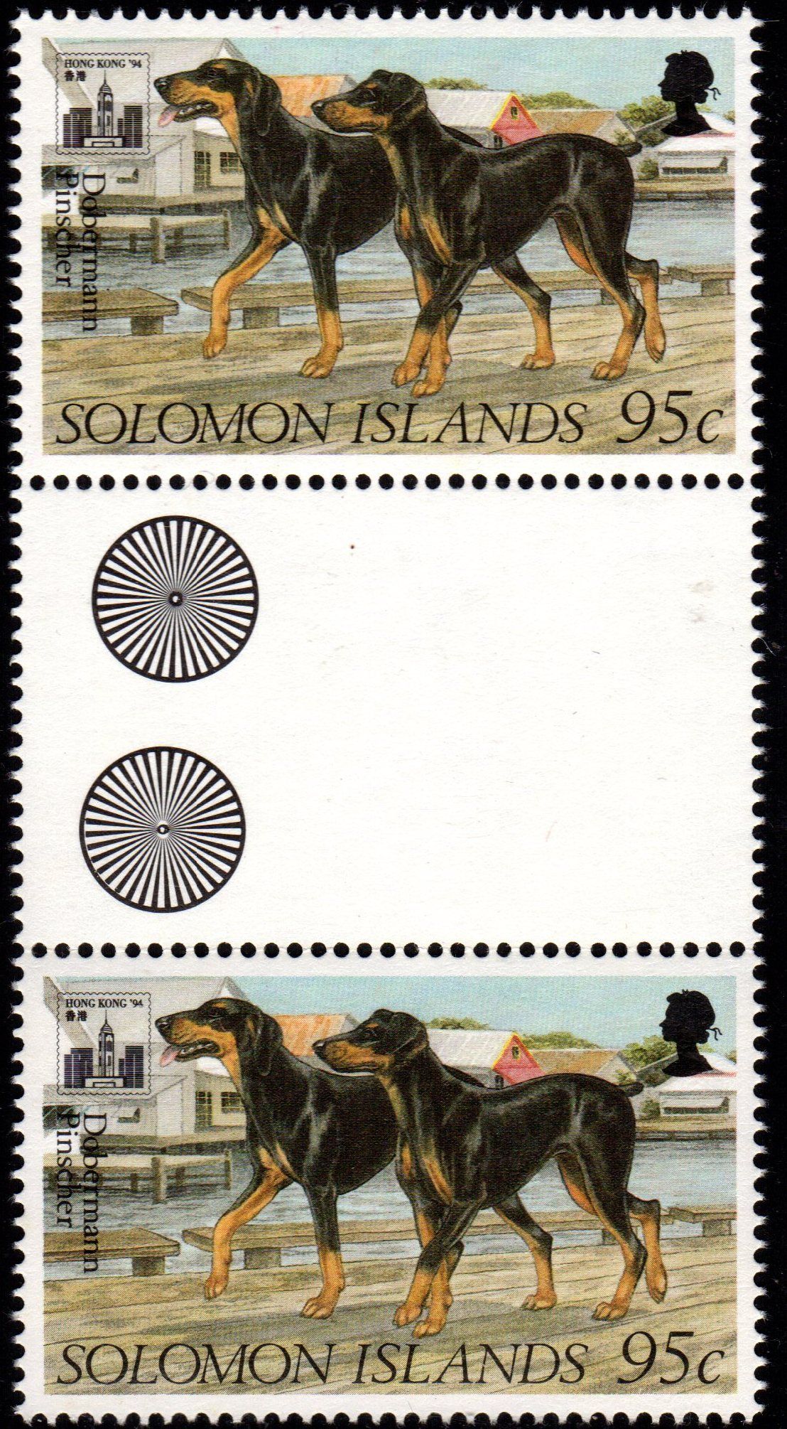 Mint never hinged gutter pair, Scott #769, issued in 1994, with a design featuring Dobermann pinscher dogs.