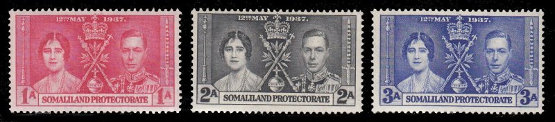 Somaliland Protectorate, Scott #81-83, 1937 Coronation issues in Mint Never Hinged condition.Scott 2026 Catalogue Value $2.00