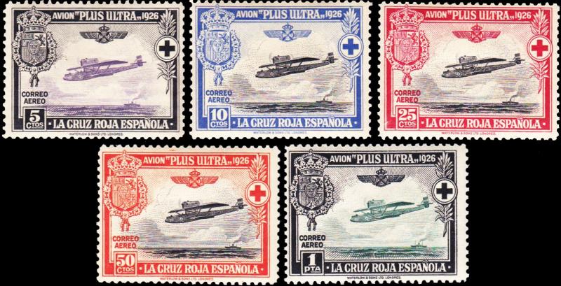 5c, 10c, 25c, 50c and 1P Ramon Francos Plane Plus Ultra Red Cross Airmail Semi-Postal. Unused hinged.