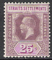 STRAITS SETTLEMENTS #194 Country: Straits Settlements Year: 1921-1932 Scott Catalogue #: 194 (1) Description: 25c Violet & Red Violet Condition: Mint, Hinged - Die Ii, Type I Keywords/Remarks: ... Read More