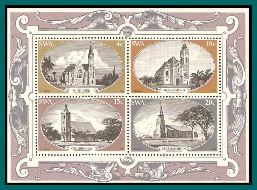 Miniature sheet featuring historic churches with Lutheran Churches at Windhoek and Swakopmund; Rhenish Mission Churches at Otjimbingwe and Keetmanshoop.The scan is an example of the sheet you will receive.