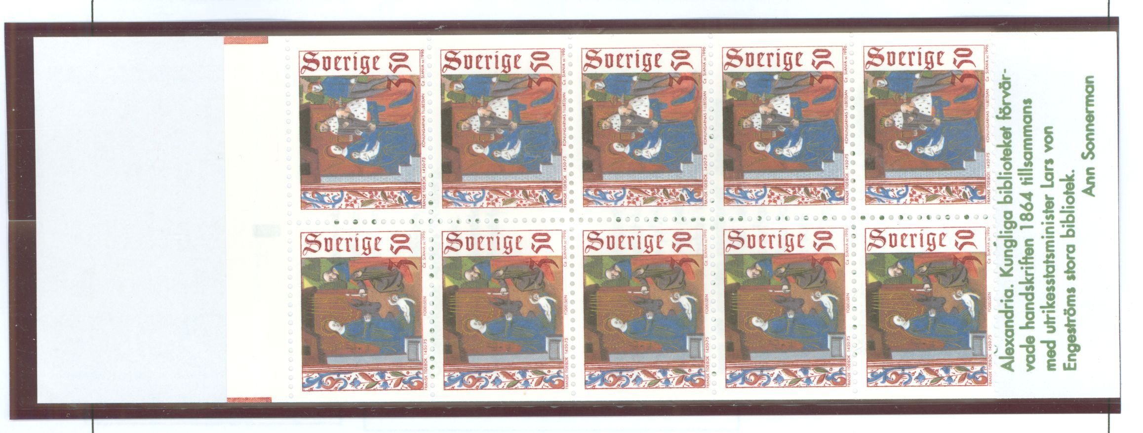 1996 booklet of 10 Christmas stamps, 2 designs, 5 each, 3.50Kr, type A666. APS Stamp Id: 501998825 APS Seller Id: 554912 Hinge Type: NH