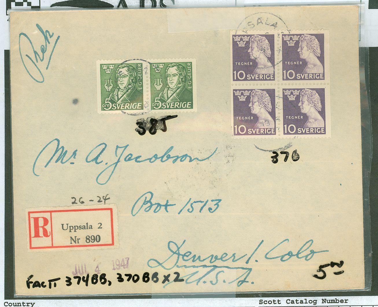 370 block of 4, 385 pair, cover, uppsala APS Stamp Id: 501111169 APS Seller Id: 689403 Hinge Type: Not Specified