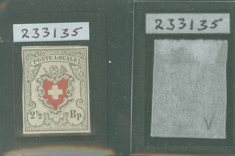 RPSL Ltd. Cert. #233135, Dated 7.21.2021, Switzerland 1850-51, S. G. # 3, 2 1/2r Black and Red, Imperf, Inscribed Poste Locale - Type a, central cross with black frame - Unused, heavily hinged - is Genuine. Observation: R 1/7 on sheet of 40. HR and Paper Adherence at Top (Back side scan).APS Stamp Id: 501565436