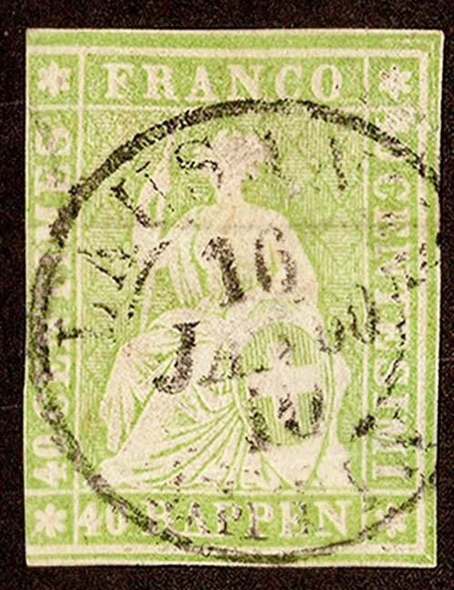 40r Yellow Green Struebel Seated Helvetia Thick Ordinary Paper Rough Impressions and Green Silk Threads. Used.Seller Information