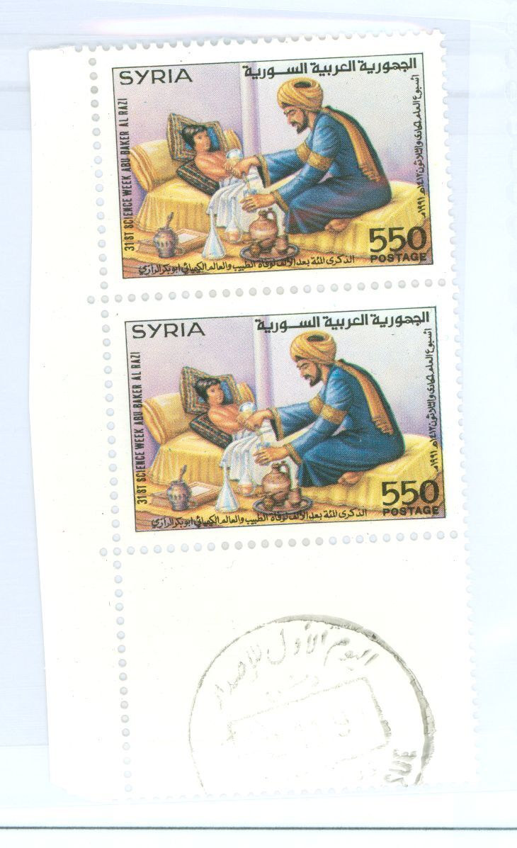 1991 31st Science Week; 1100 Anniversary Death of Abu Baker Al Razi, famous physician; single stamp, pair of stamps with tab first day cancel, MNH APS Stamp Id: 501811959 APS Seller Id: 779521 Hinge Type: NH