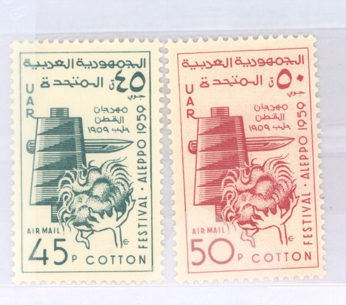 1959 UAR Cotton Festival & Fair, Aleppo City, Spinning, Cotton Ball and Thread Two air mail stamps APS Stamp Id: 502059303 APS Seller Id: 779521 Hinge Type: NH Other Catalog Name: Michel Other Catalog Number: ... Read More