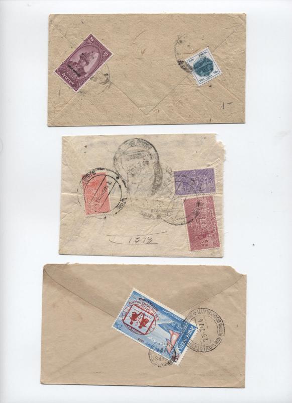 Group of 3 Nepal covers, all with stamps on reverse, one apparently local and the others to India. Two with official stamps (one with 3 stampsl the other with an unissued and subsequently remaindered 10p issue, with a scott footnote that some exist on cover and "may have been used as postage stamps". This makes a good example. Third cover has a 1974 issue and clear 1974 postmark.Your