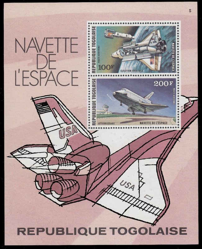 Togo, Scott #C328a, 1977 Space Shuttle Trials in the US Souvenir Sheet Air Post issue in Mint Never Hinged condition.Scott 2026 Catalogue Value $3.00