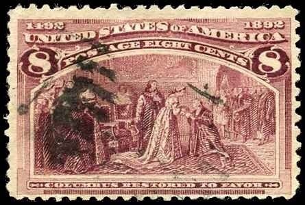 Detailed Analysis of Scott #236 Design This is an 8-cent "Columbus Restored to Favor" stamp from the 1893 Columbian Exposition series. The scene depicts Christopher Columbus being received back into favor by the Sp ... Read More
