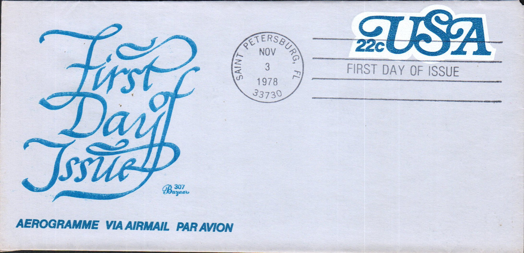 #UC51 USA Aerogram first day cover by Bazaar. The edges and down the right edge of the cachet below the postmark are creased and there are spots within the cachet. Postmark State: FL City: Saint Petesburg Year: 1978 Month: 11 Day: 3Seller Information