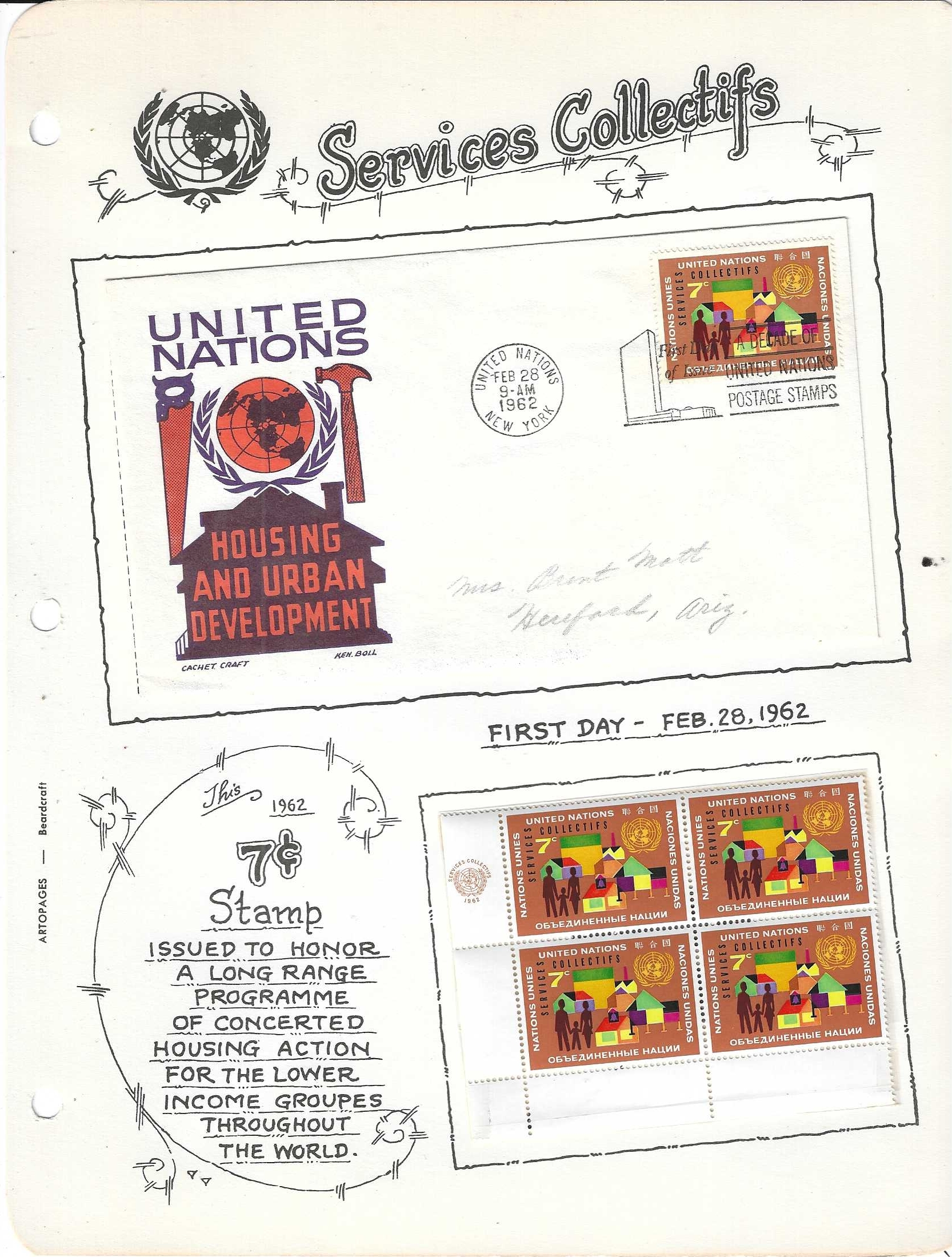 Cachet Craft FDC & UN Postal Service margin block mounted on an Artocraft designed page.