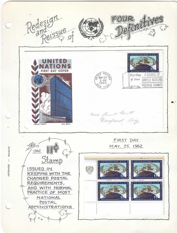 Cachet Craft FDC & UN Postal Service margin block mounted on an Artocraft designed page.