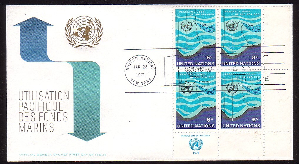 United Nations, Scott #215 Inscription Block of 4, 1971 Peaceful Uses of the Sea Bed - Sea Bed, School of Fish and Underwater Research issues First Day Cover.Please note that I make every attempt to describe any faults that cannot be seen in the scan. If I make an error and you are unhappy with your lot, please let me know and give me a chance to satisfy your requirements.