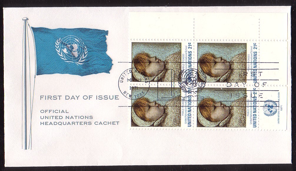 United Nations, Scott #225 Inscription Block of 4, 1971 United Nations International School - "Maia" by Picasso issues First Day Cover.Please note that I make every attempt to describe any faults that can not be seen in the scan.If I make an error and you are unhappy with your lot, please let me know and give me a chance to satisfy your requirements.