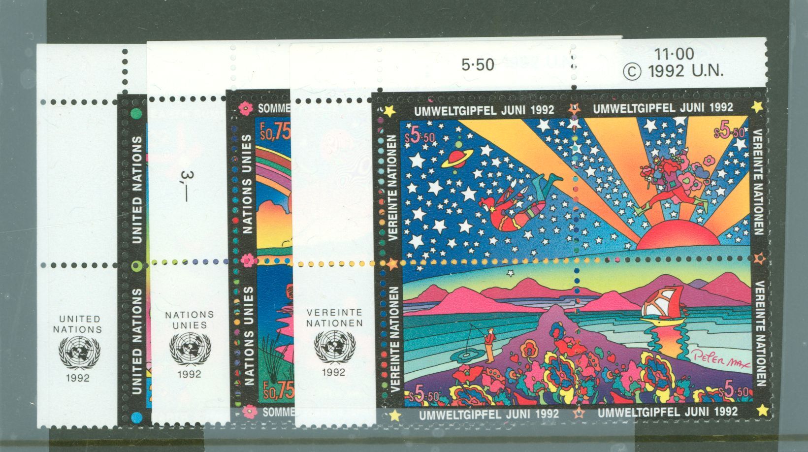 1992 Earth Summit blocks of 4 with inscription, including UN-NY 608A, UN-Geneva 219A and UN-Vienna 132A APS Stamp Id: 502062034 APS Seller Id: 788564 Hinge Type: NH