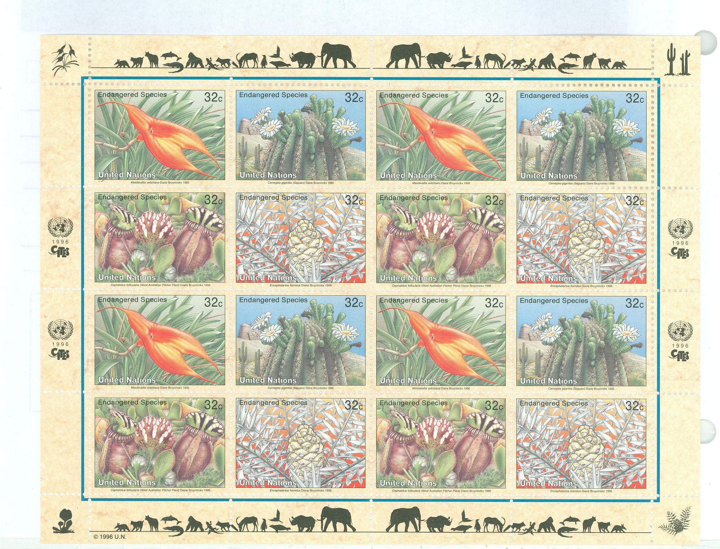 1996 Endangered Flora sheet of 16 in four designs 32c each APS Stamp Id: 501739386 APS Seller Id: 523632 Hinge Type: NH