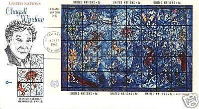 Very beautiful stamp panel depicting the Chagall window, a 12 x 15 ft stained glass panel in the UN building. Dedicated to Dag Hammarskjold and others who died during peace keeping mission in the Congo. Nice Condition. With descriptive insert.Seller Information
