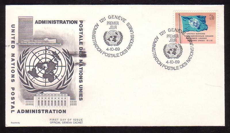 United Nations-Geneva, Scott #2, 1969 United Nations Flag issue First Day Cover.Scott 2017 Catalogue Value $1.00