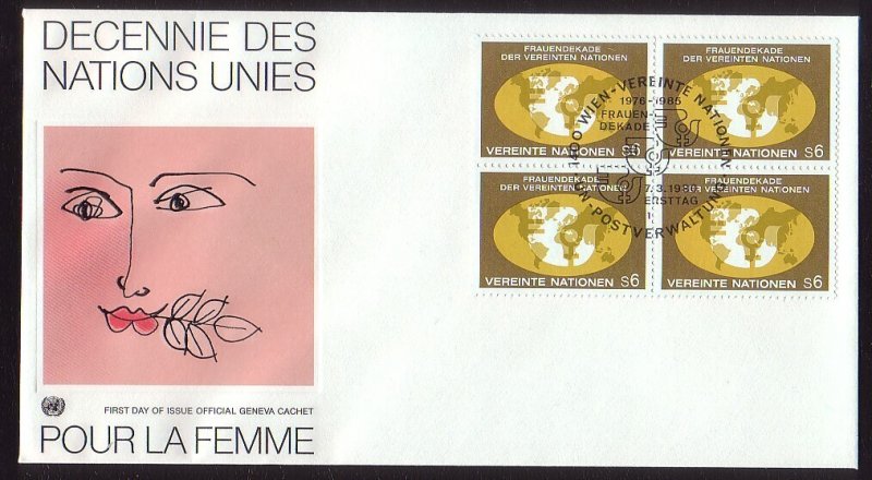 United Nations-Vienna, Scott #10 Block of 4, 1980 United Nations Decade for Women issues First Day Cover. Please note that I make every attempt to describe any faults that cannot be seen in the scan. If I make an e ... Read More