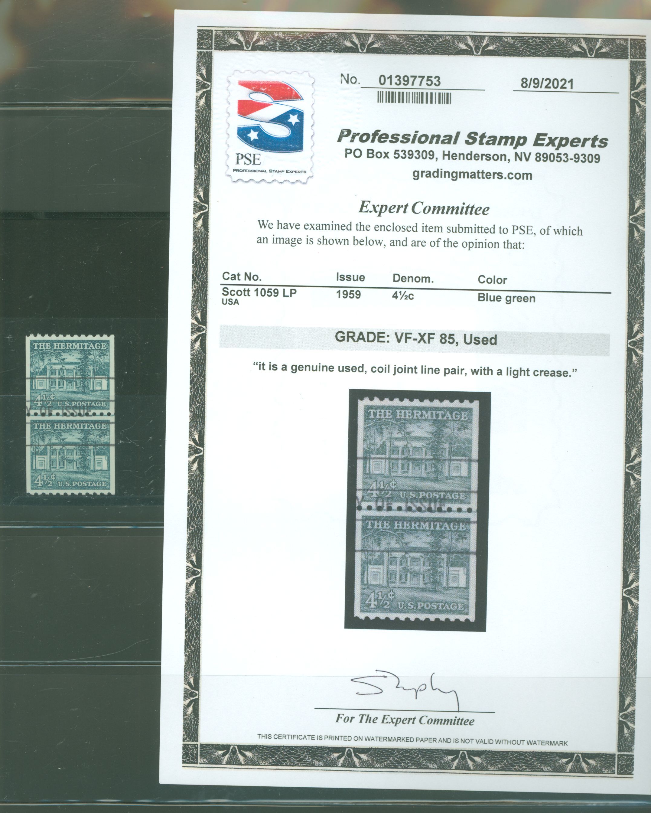 1959 4 1/2c Hermitage coil line pair graded "VF-XF 85, used" with PSE cert. #01397753 dated: 8/9/2021 states: "it is genuine used, coil joint line pair, with a light crease"APS Stamp Id: 501688939