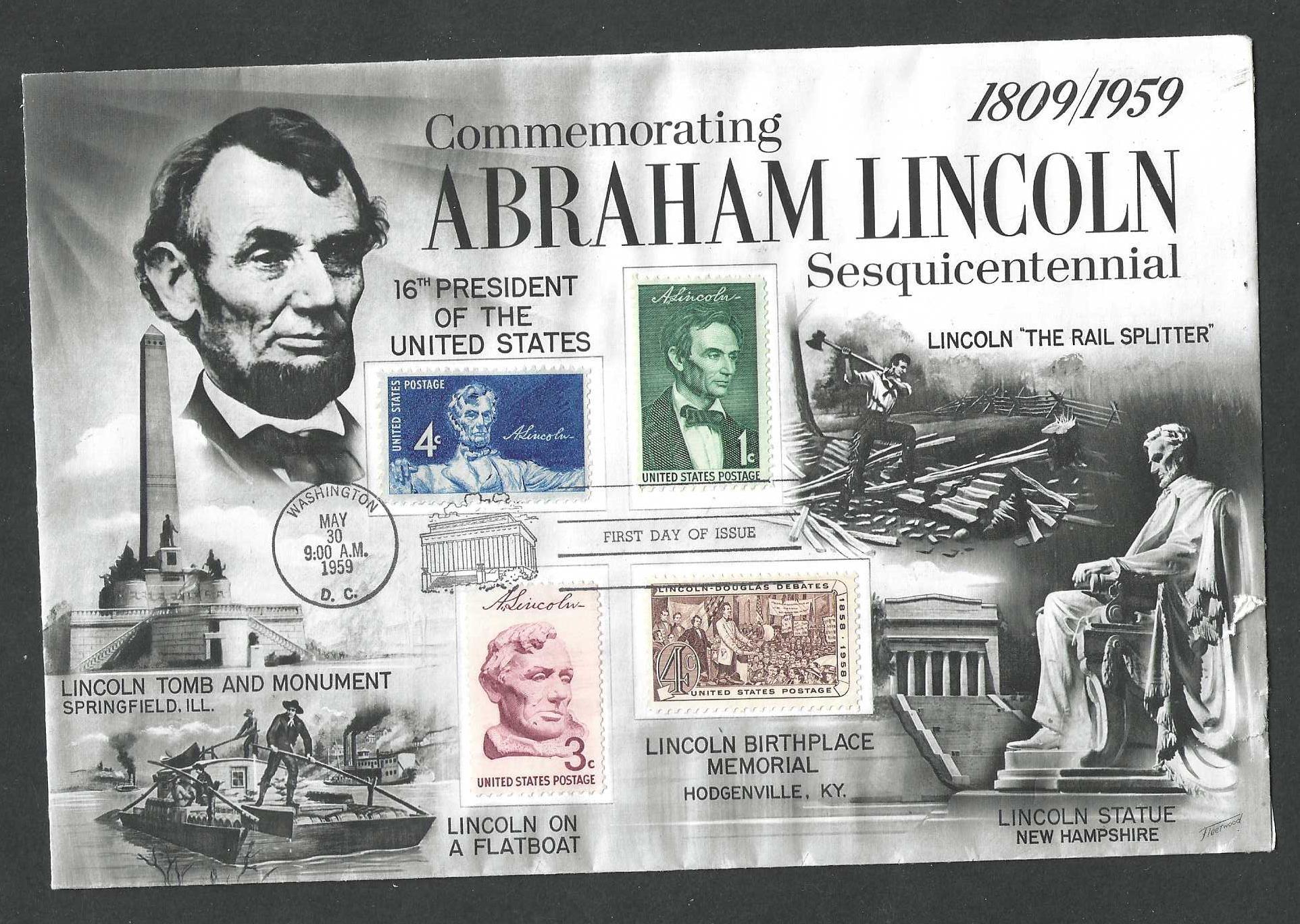 Abraham Lincoln FDC Dark blue -May 30,1959 Green -Feb 12, 1959 Dark rose-Feb 27, 1959 Sedia -Aug 27, 1958 Two small rips lower right.