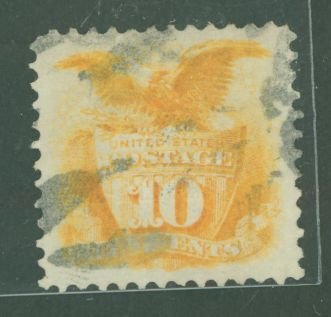 1869 10c shield & eagle, yellowish orange, "G" grill; huge margins, decent cancel. Includes Graded PSE cert #01253197, dated 8/2/2012-"grade: XF90, used; it is genuine used." SMQ: 425.00APS Stamp Id: 501767752