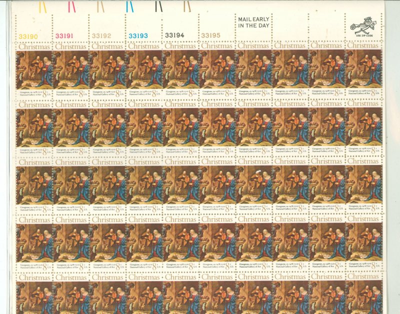 1971 Christmas issue Adoration of the Shepherds of Giorgione Full pane of 50 8c stamps staple holes on top marginAPS Stamp Id: 501935975