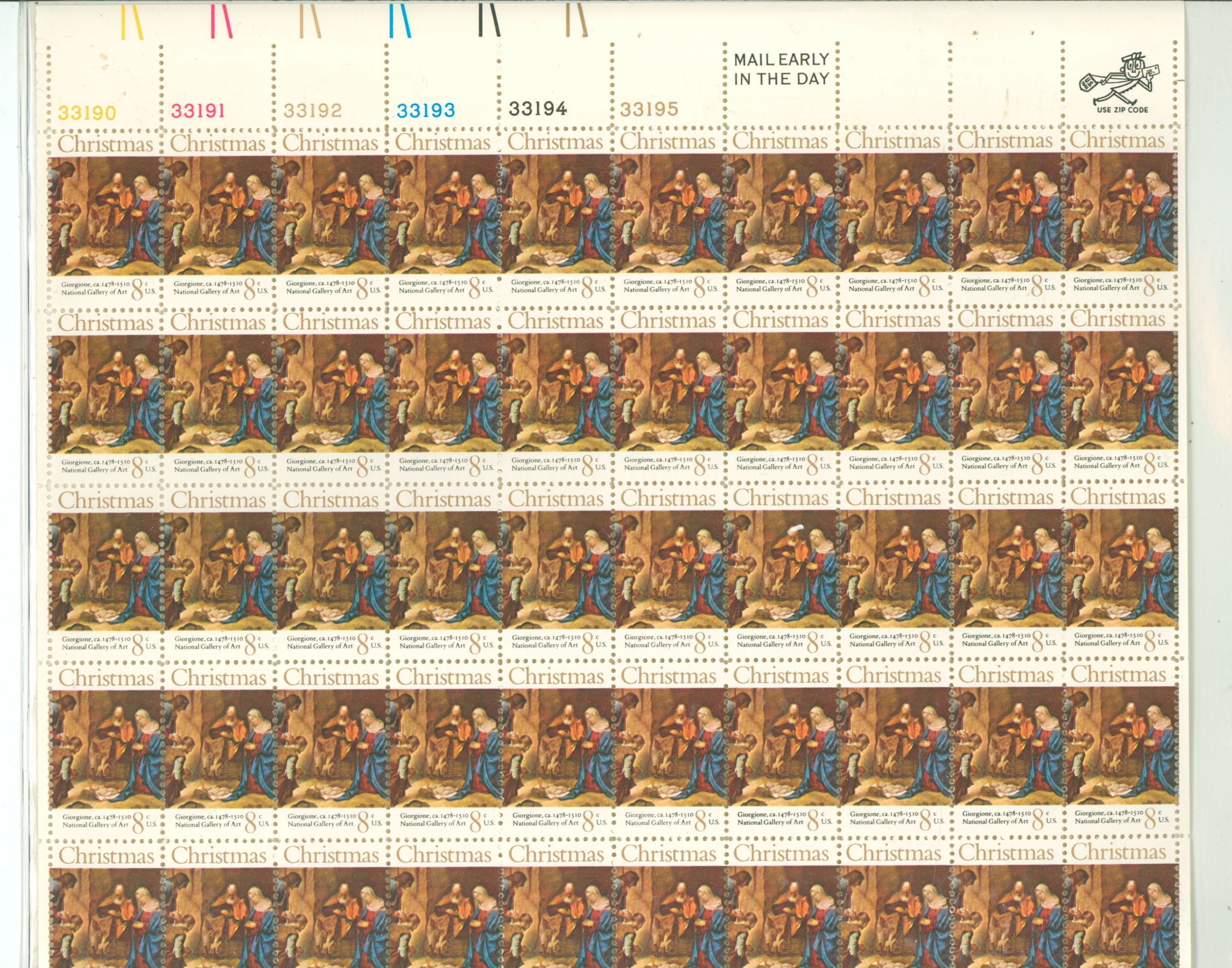 1971 Christmas issue Adoration of the Shepherds of Giorgione Full pane of 50 8c stamps staple holes on top margin APS Stamp Id: 501935975 APS Seller Id: 604249 Hinge Type: NH