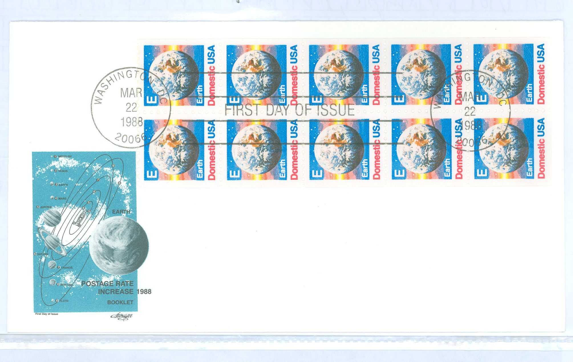 1988 25c "E" Earth FDC booklet pane of 10 stamps, Artmaster cachet, choiceAPS Stamp Id: 501364640