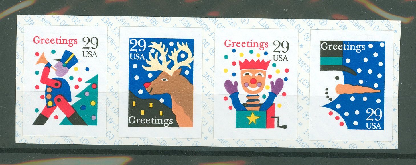 1993 Christmas toy soldier, snowman, Jack in the box, reindeer, s/a coil strip of 4. APS Stamp Id: 501719077 APS Seller Id: 534232 Hinge Type: NH Other Catalog Name: Brookman