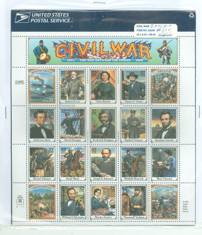 1995 32c Civil War, pane of 20 stamps sealed in the original United States postal service wrapAPS Stamp Id: 502065452