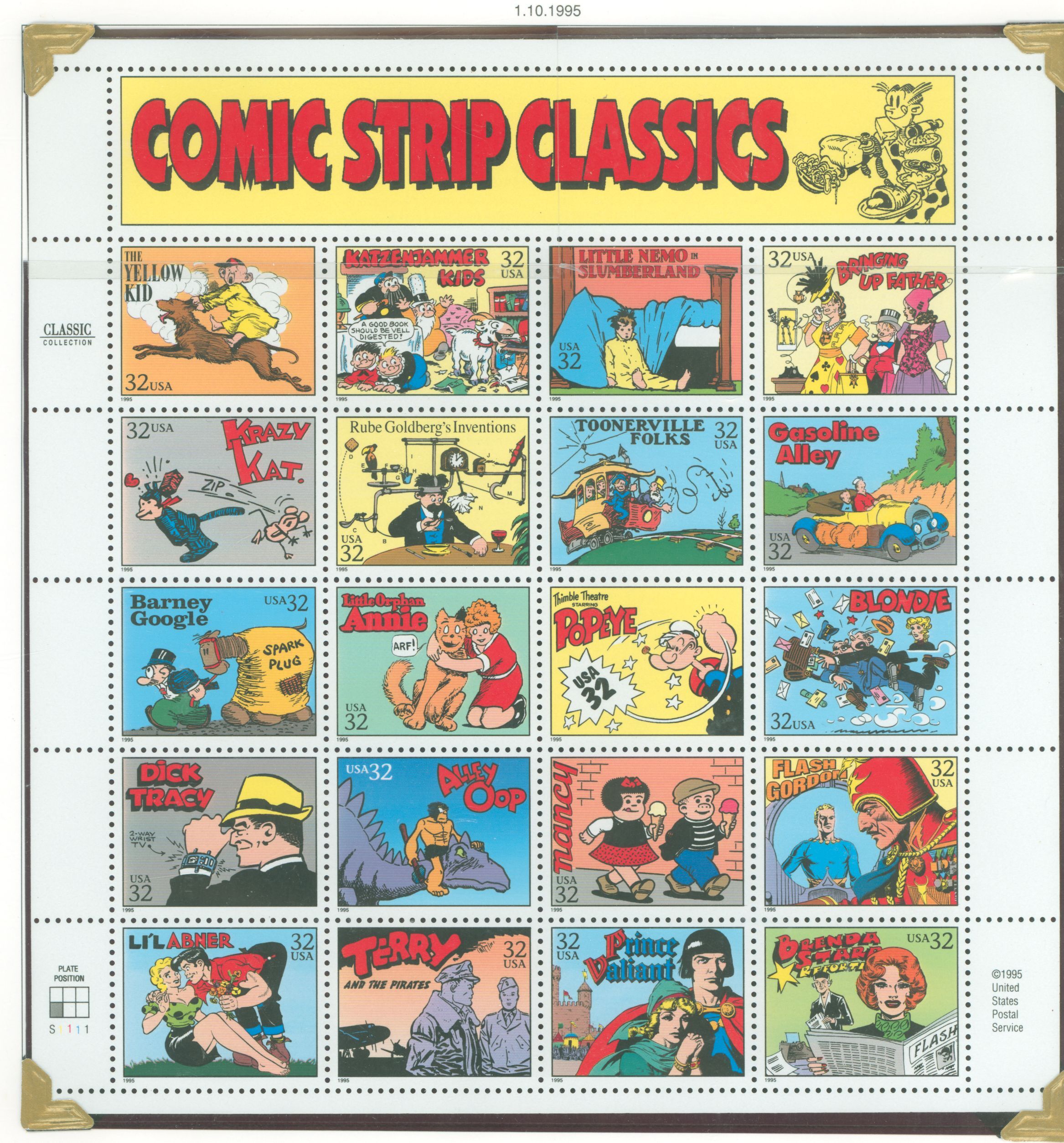 1995 Comic Strip Classics, Popeye, Dick Tracy, Set on pane of 20APS Stamp Id: 501757275