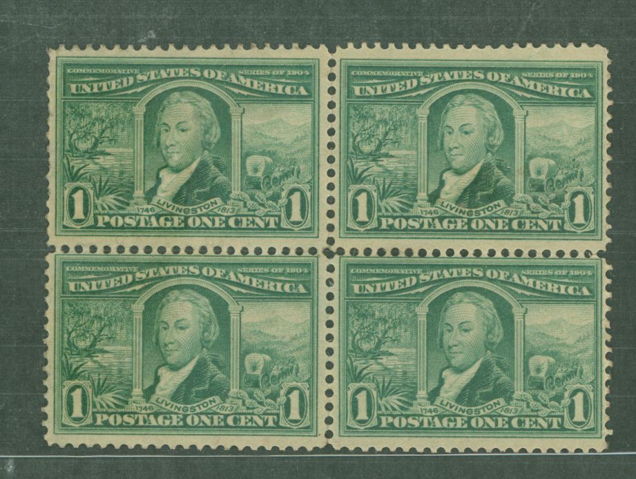 1904 Louisiana Purchase Expo; MNH block of 4, perf seps UR & bottom, gum disturbances. APS Stamp Id: 501917494 APS Seller Id: 779594 Hinge Type: NH