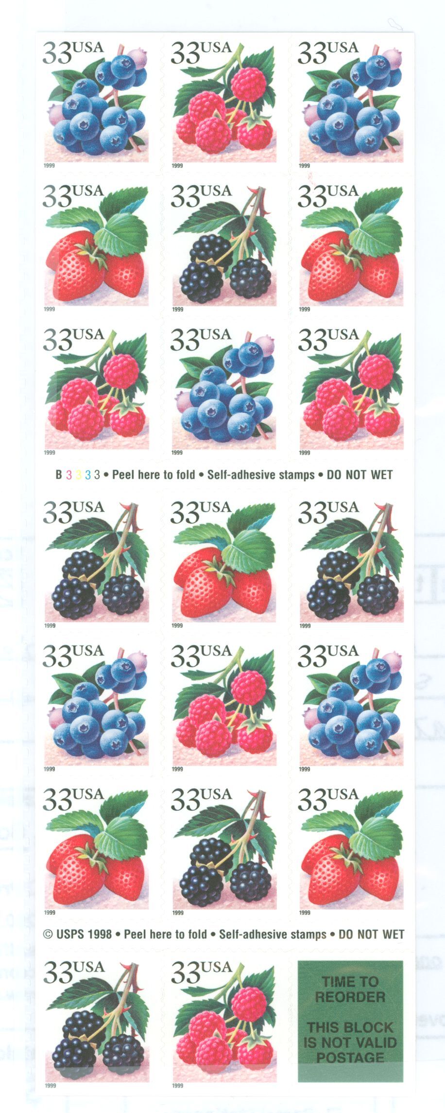 1999 Flora, Fruit, Berries, Complete S/A Booklet of 20, with Plate #B3333APS Stamp Id: 501757231