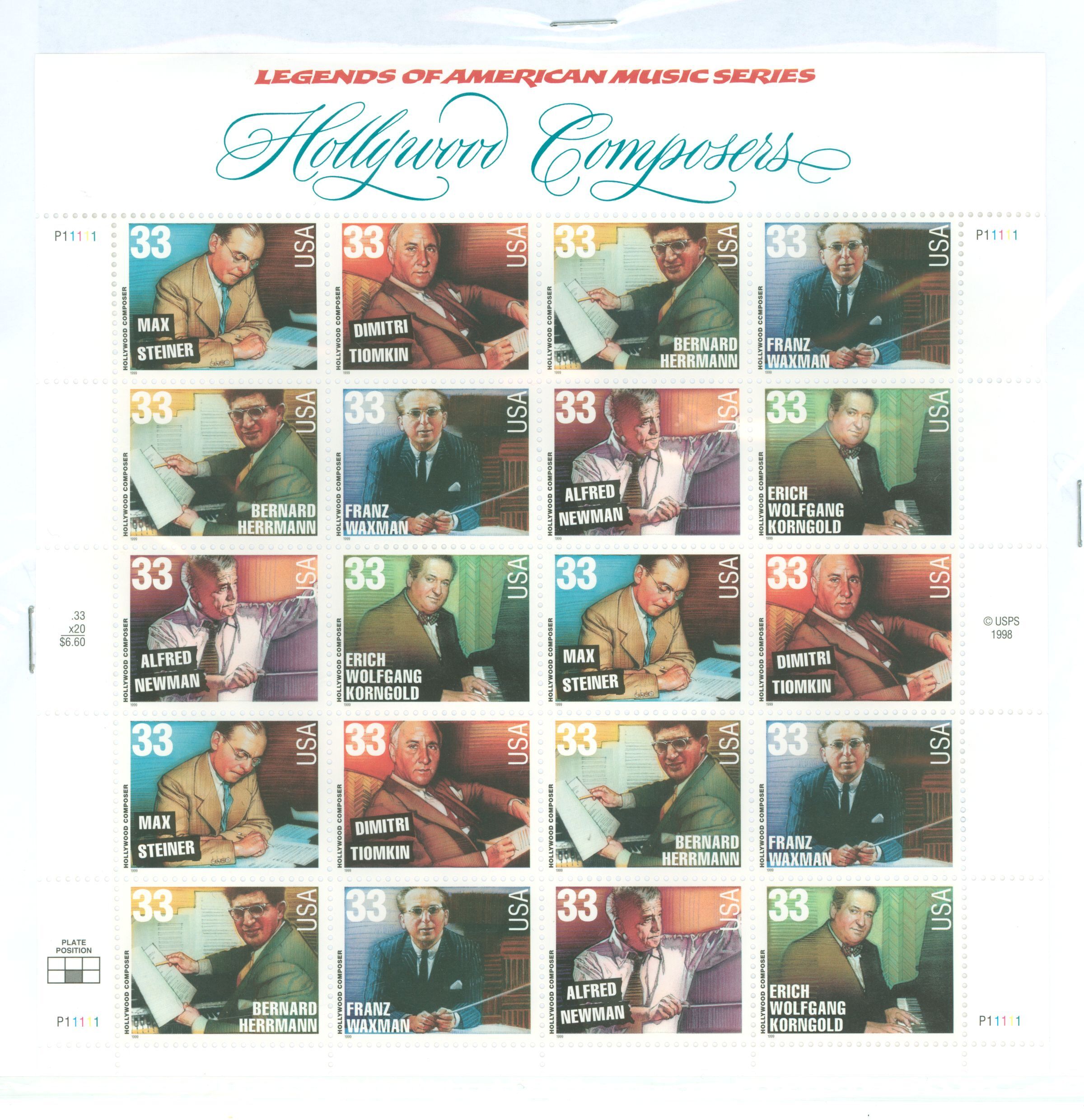 1999 33c Hollywood Composers, full pane of 20 stampsAPS Stamp Id: 501730009