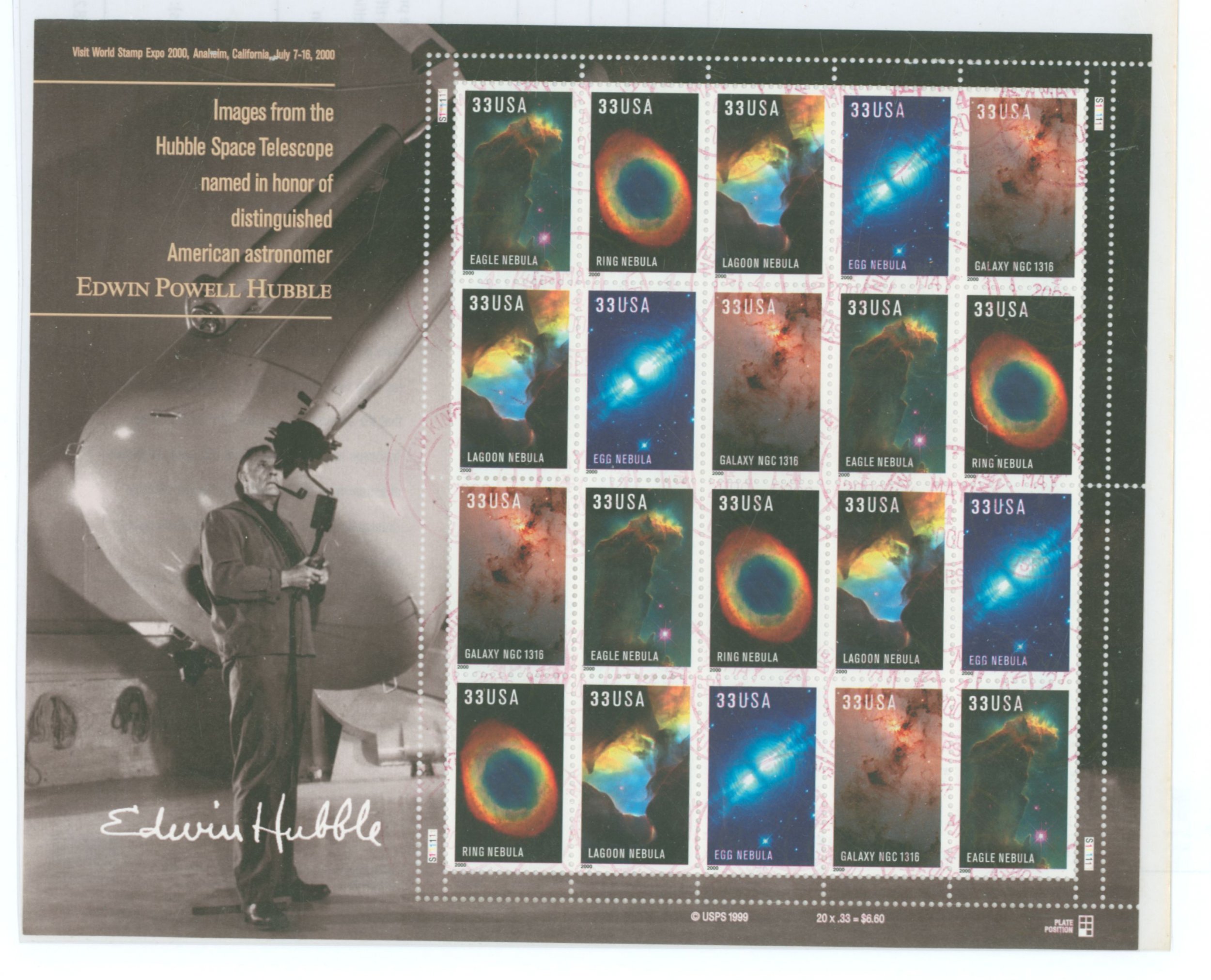 2000 Commemorative Edwin Powell Hubble Telescope, Five stamps in a pane of 20 canceled, but not used, with a New Kingston, PA, postmark APS Stamp Id: 501717103 APS Seller Id: 782475 Hinge Type: NH