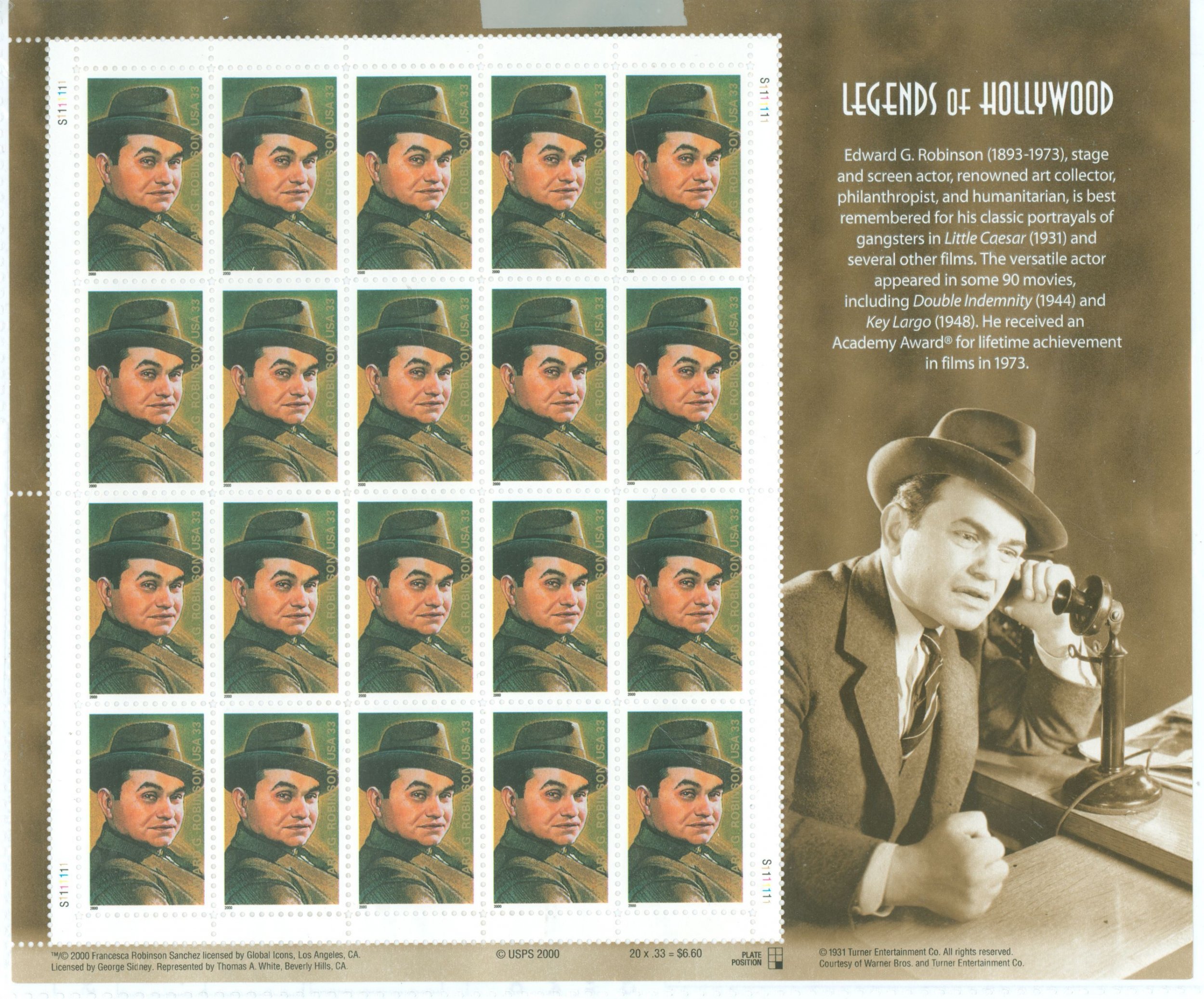 2000 Legends of Hollywood; 33c Edward G. Robinson pane of 20APS Stamp Id: 501785160