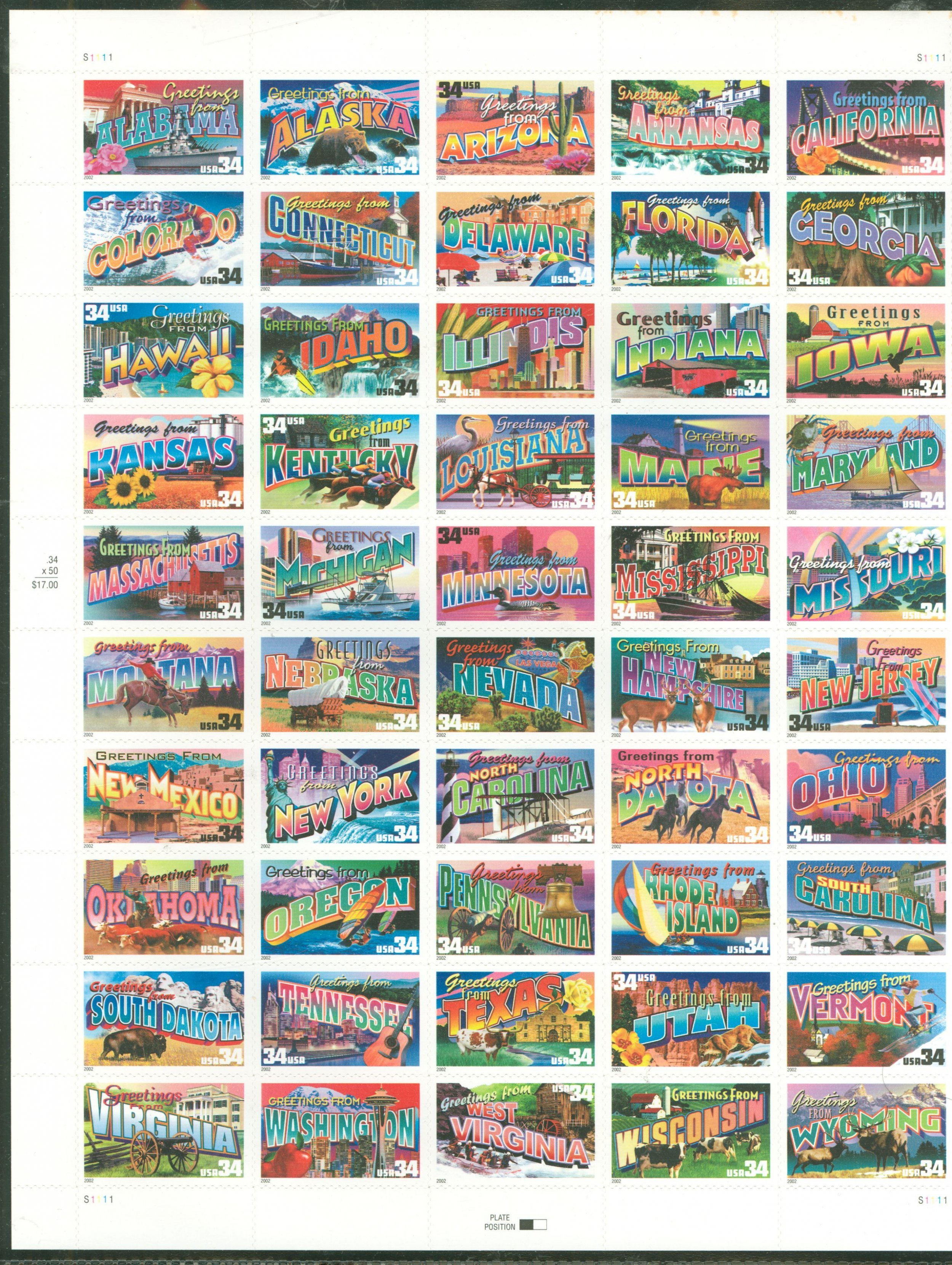 2002 Greetings from America sheet of 50APS Stamp Id: 501806480