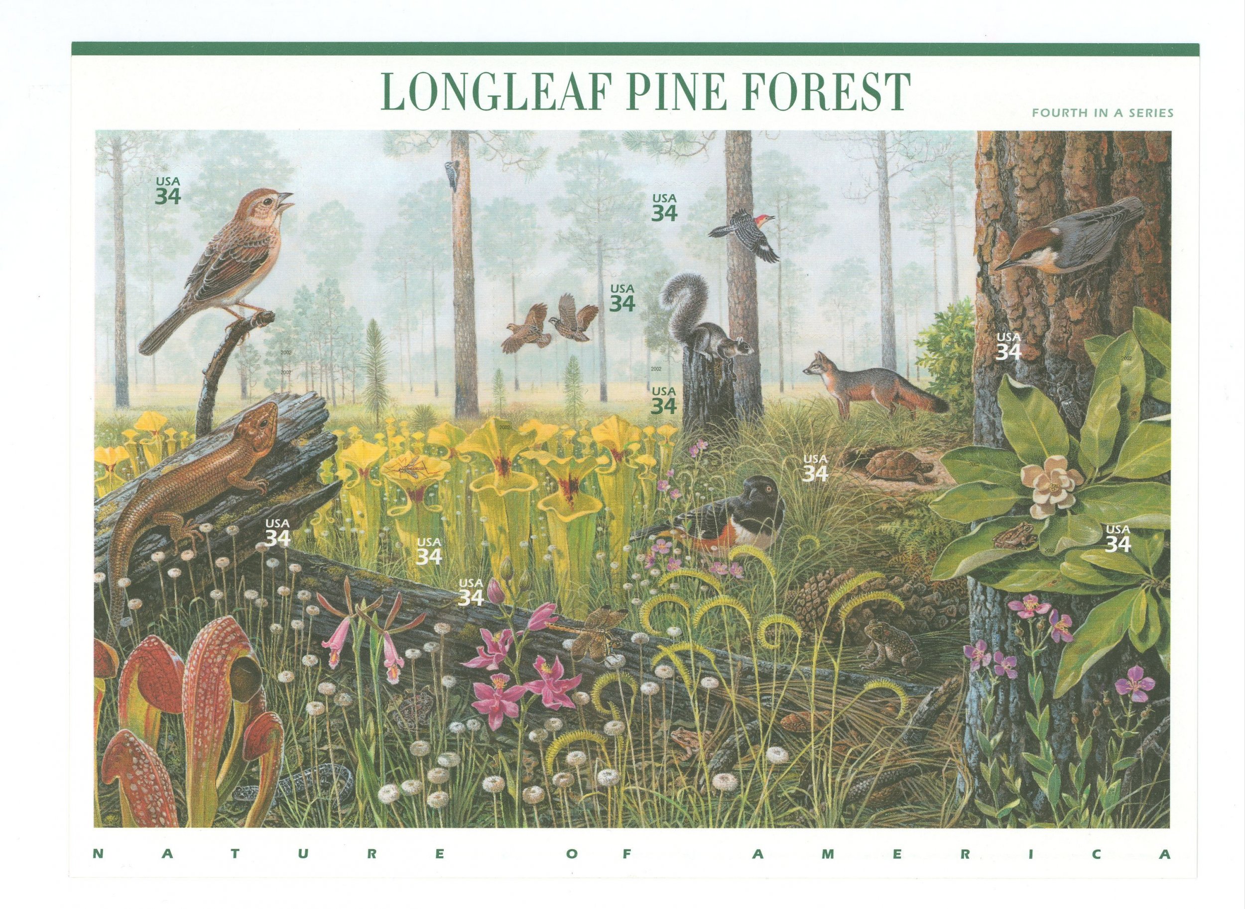 Nature of America- Longleaf Pine Foresty, fauna and flora, birds, trees, complete s/a pane of 10; protected by sturdy backing board. APS Stamp Id: 501719276 APS Seller Id: 534232 Hinge Type: NH Other Catalog Nam ... Read More