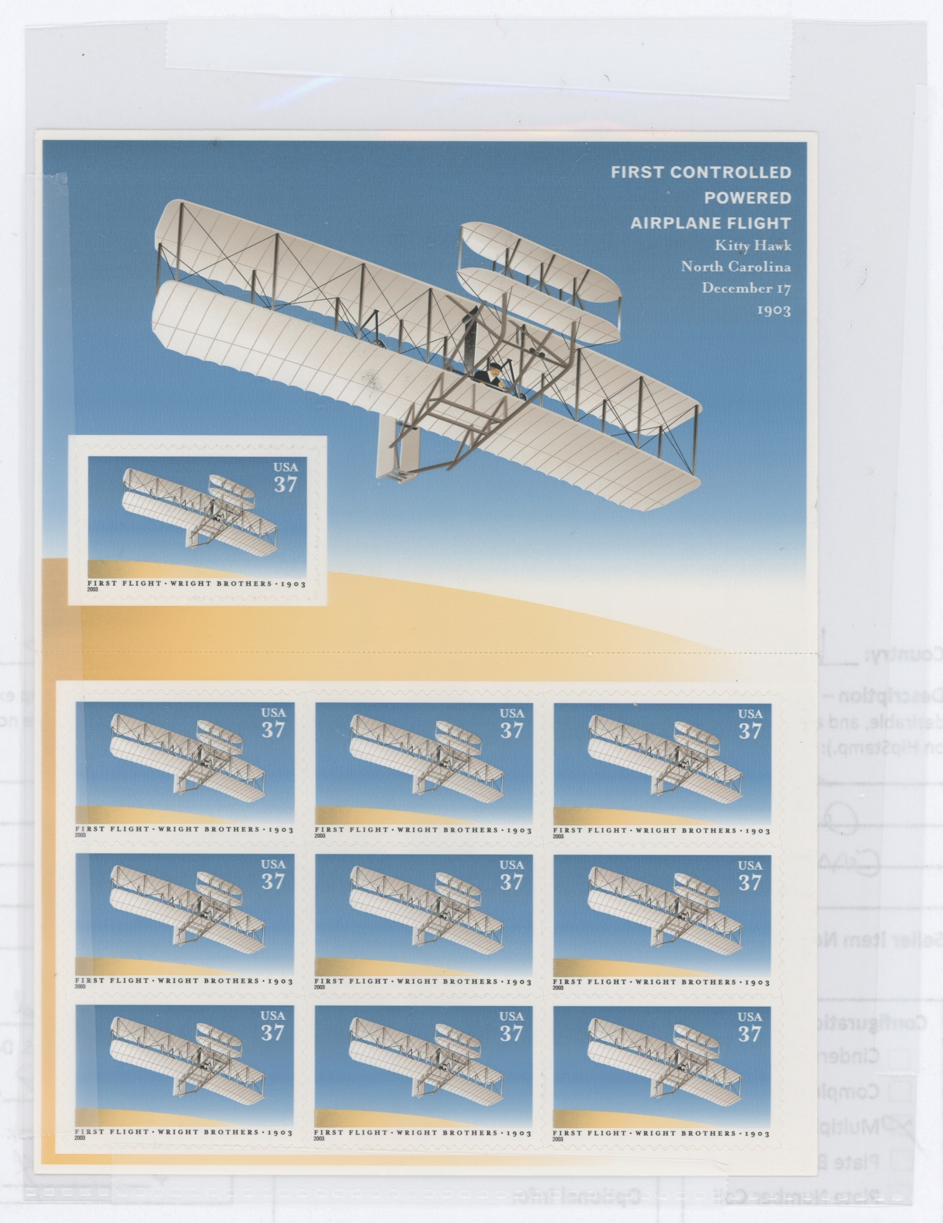 2003 Wright Brothers First Flight Centennial. Plane. Complete S/A pane of 10. APS Stamp Id: 501859980 APS Seller Id: 534232 Hinge Type: NH Other Catalog Name: Scott Specialized 2023